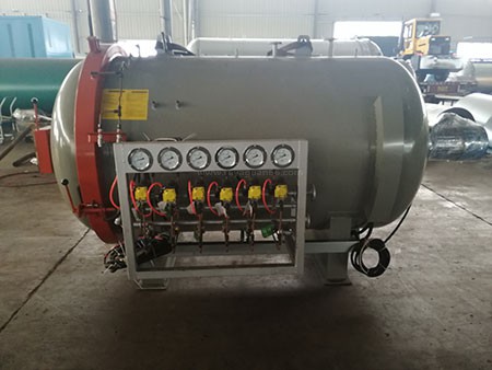 在工作的過程中罐內(nèi)會有抽真空的步驟,一般來講該設(shè)備都是多路抽真空的,罐外可以看到有著一排的真空表進行每一個管路進行抽真空,我們?yōu)榱俗寜毫_到我們想要的結(jié)果還要對罐內(nèi)進行加壓,壓力作用于制品上這樣就能更快的滲透和固化使得整個熱壓固化過程加速,一般來說現(xiàn)在的熱壓罐都是高壓熱壓罐。